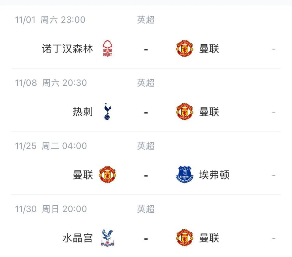 进入11月,曼联将先后对阵诺丁汉森林、热刺、埃弗顿和水晶宫,四个对手强弱分明,热刺目前位列第三,水晶宫位列第十,埃弗顿和诺丁汉森林位居中下游。